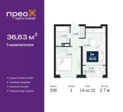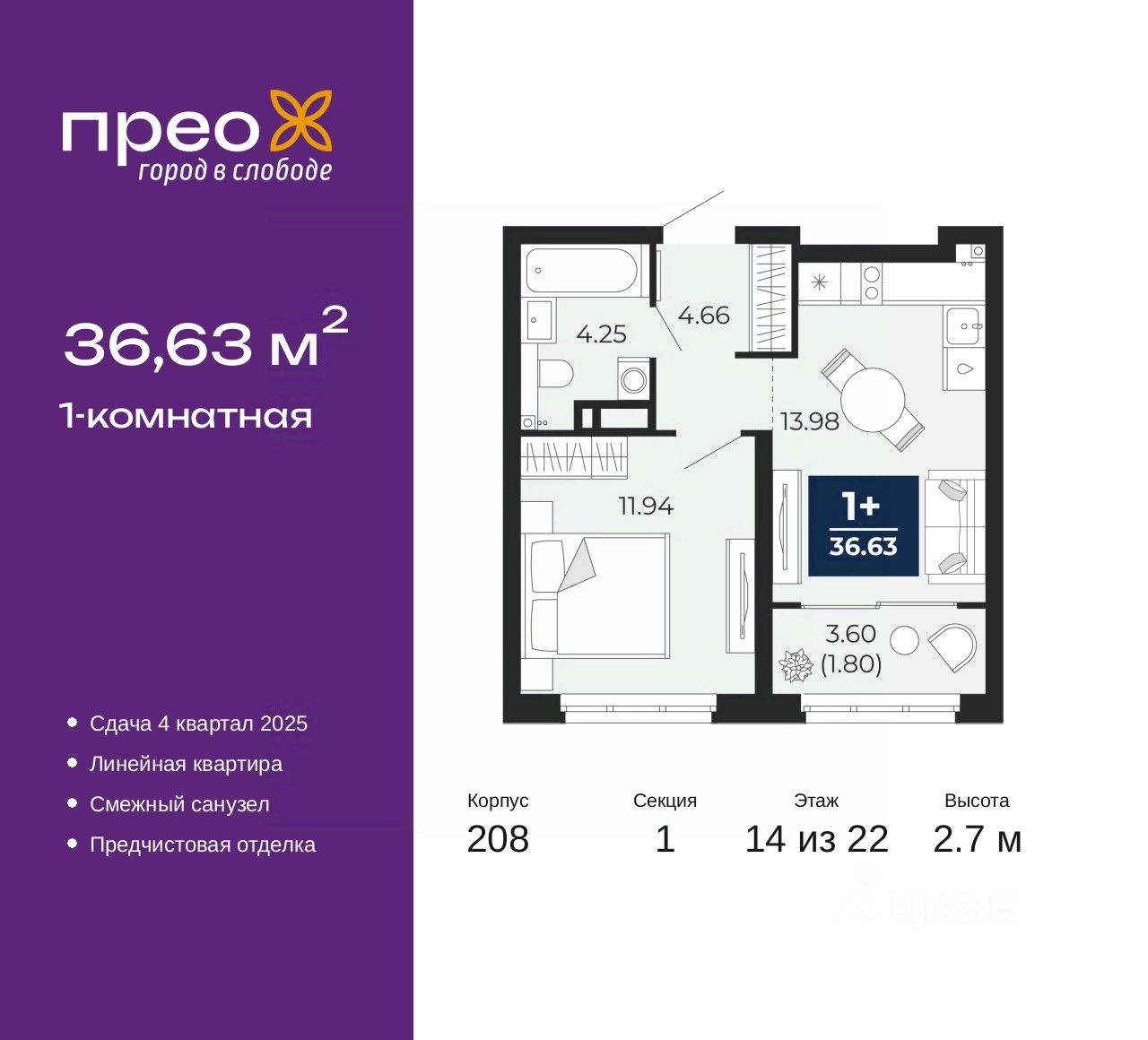 1-комн. квартира от застройщика с предчистовой отделкой в ЖК "Прео" на 14 этаже. Общая площадь: 36.63 кв.м., жилая: 11.94 кв.м., площадь просторной кухни-столовой: 13.98 кв.м. Все окна выходят на одну сторону. В квартире один совмещенный санузел. Высота потолков 2.7 м.