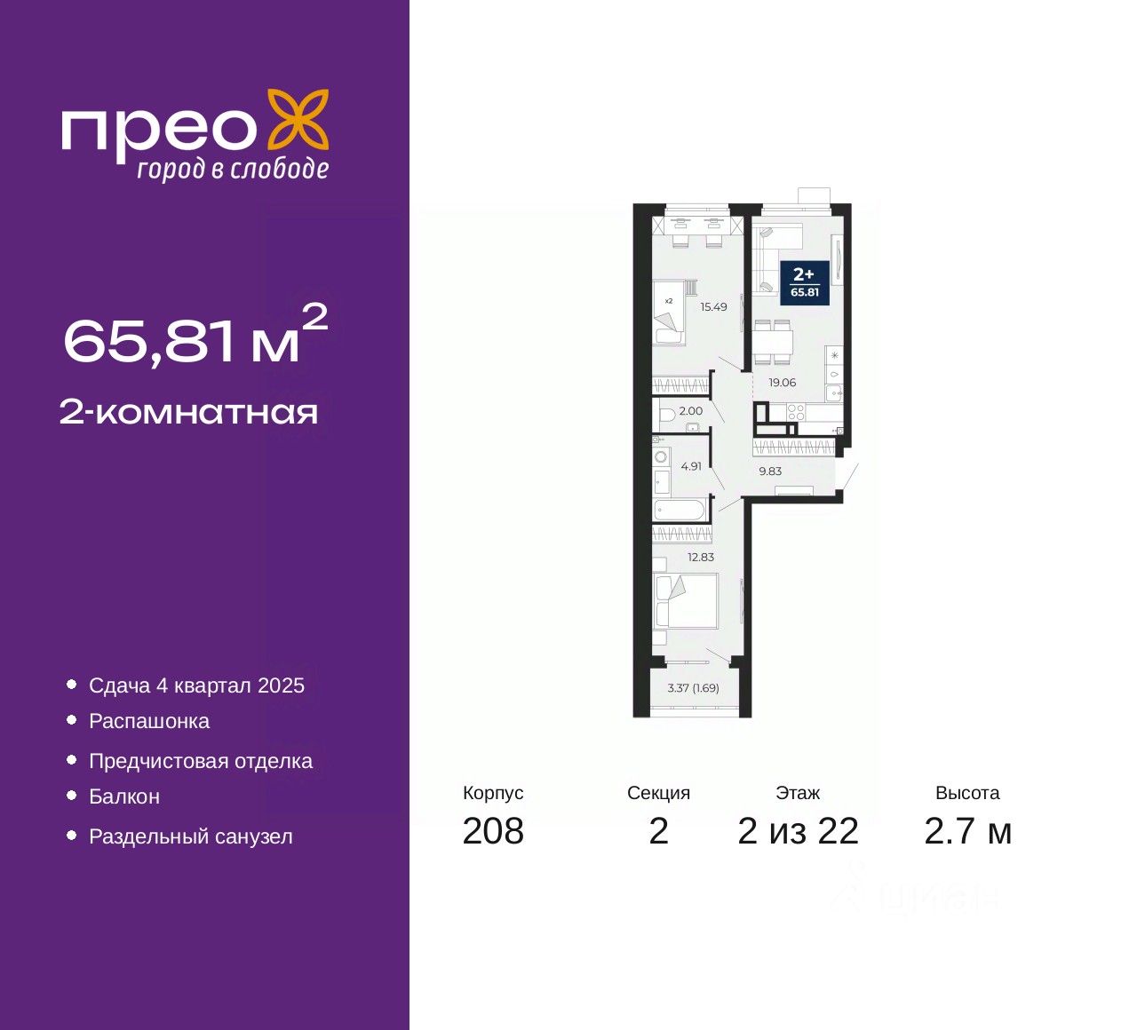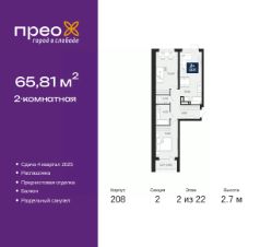 2-комн. квартира от застройщика с предчистовой отделкой в ЖК "Прео" на 2 этаже. Общая площадь: 65.81 кв.м., жилая: 28.32 кв.м., площадь просторной кухни-столовой: 19.06 кв.м. Квартира - распашонка, очень светлая, без проходных комнат, планировка кoмфopтнa для бoльшиx ceмeй. В квартире один балкон, один раздельный санузел. Высота потолков 2.7 м.