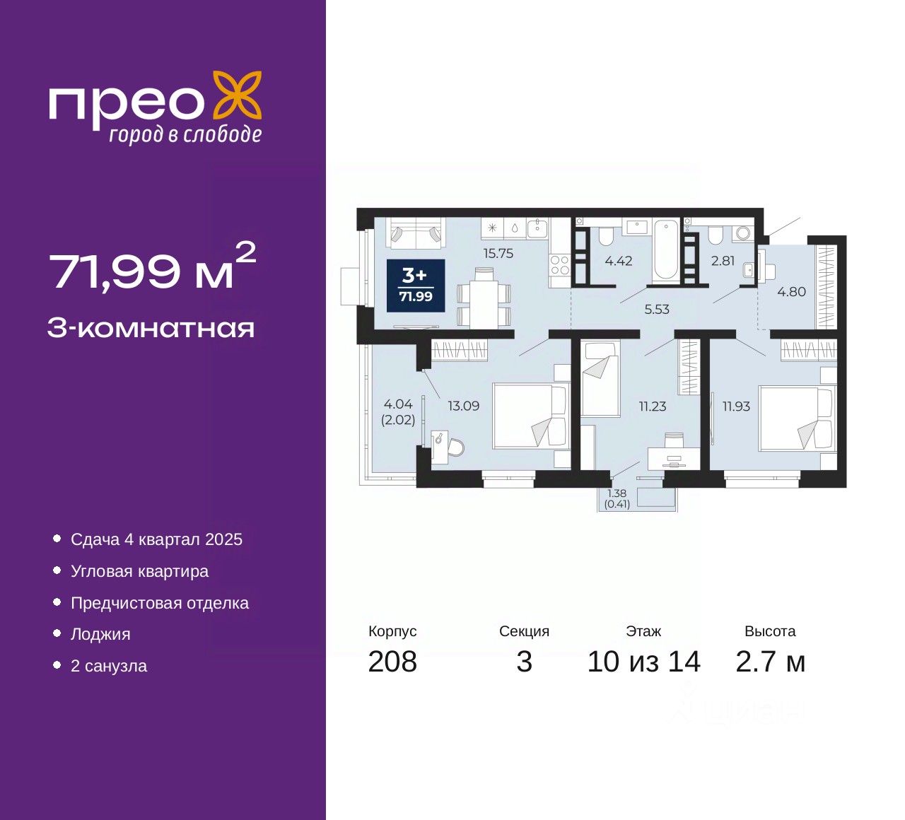 Продается трехкомнатная квартира от застройщика с предчистовой отделкой в ЖК "Прео" на 10 этаже. Общая площадь: 71.99 кв.м., жилая: 36.25 кв.м., площадь просторной кухни-столовой: 15.75 кв.м. Квартира угловая, окна oбecпeчивaют paвнoмepнoe ocвeщeниe в тeчeниe дня. В квартире одна лоджия, один совмещенный и один раздельный санузел. Высота потолков 2.7 м.