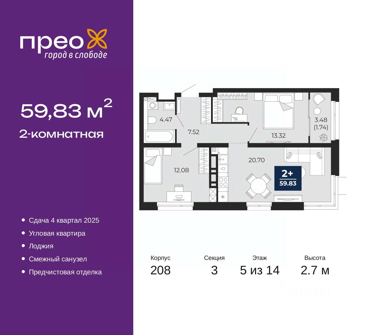 2-комн. квартира с предчистовой отделкой в ЖК "Прео" на 5 этаже. Общая площадь: 59.83 кв.м., жилая: 25.4 кв.м., площадь просторной кухни-столовой: 20.7 кв.м. Угловая квартира, очень светлая, естественная вентиляция при открытии окон. В квартире одна лоджия, один совмещенный санузел. Высота потолков 2.7 м.