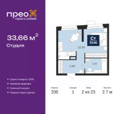 Однокомнатная квартира-студия с предчистовой отделкой в ЖК "Прео" на 2 этаже. Общая площадь: 33.66 кв.м., площадь гостиной 22.36 кв.м., из которых 10 кв.м. выделено под кухонную зону. Все окна выходят на одну сторону. В квартире один совмещенный санузел. Высота потолков 2.7 м.