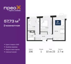 Двухкомнатная квартира от застройщика с предчистовой отделкой в ЖК "Прео" на 10 этаже. Общая площадь: 57.73 кв.м., жилая: 24.81 кв.м., площадь просторной кухни-столовой: 20.34 кв.м. Комнаты изолированные, все окна выходят на одну сторону. В квартире один совмещенный санузел. Высота потолков 2.7 м.