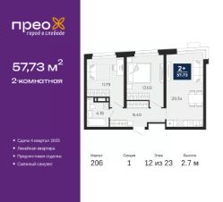 2-комн. квартира от застройщика с предчистовой отделкой в ЖК "Прео" на 12 этаже. Общая площадь: 57.73 кв.м., жилая: 24.81 кв.м., площадь просторной кухни-столовой: 20.34 кв.м. Комнаты изолированные, все окна выходят на одну сторону. В квартире один совмещенный санузел. Высота потолков 2.7 м.