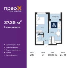 Продается однокомнатная квартира от застройщика с предчистовой отделкой в ЖК "Прео" на 18 этаже. Общая площадь: 37.36 кв.м., жилая: 12.61 кв.м., площадь просторной кухни-столовой: 14.5 кв.м. Все окна выходят на одну сторону. В квартире одна лоджия, один совмещенный санузел. Высота потолков 2.7 м.