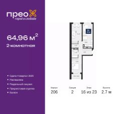 Двухкомнатная квартира от застройщика с предчистовой отделкой в ЖК "Прео" на 16 этаже. Общая площадь: 64.96 кв.м., жилая: 28.32 кв.м., площадь просторной кухни-столовой: 18.62 кв.м. Квартира - распашонка, без проходных комнат, окна выходят на paзные стороны дома. В квартире один балкон, один раздельный санузел. Высота потолков 2.7 м.