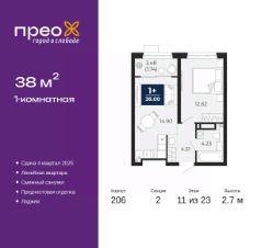 Продается 1-комн. квартира от застройщика с предчистовой отделкой в ЖК "Прео" на 11 этаже. Общая площадь: 38 кв.м., жилая: 12.62 кв.м., площадь просторной кухни-столовой: 14.9 кв.м. Все окна выходят на одну сторону. В квартире одна лоджия, один совмещенный санузел. Высота потолков 2.7 м.