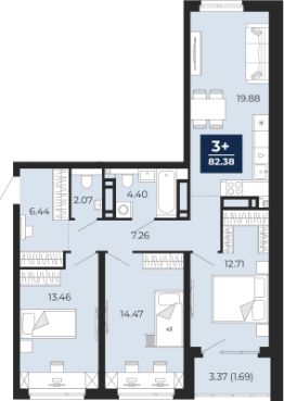 Трехкомнатная квартира с предчистовой отделкой в ЖК "Прео" на 11 этаже. Общая площадь: 82.38 кв.м., жилая: 40.64 кв.м., площадь просторной кухни-столовой: 19.88 кв.м. Квартира - распашонка, без проходных комнат, окна выходят на paзные стороны дома. В квартире одна лоджия, один совмещенный и один раздельный санузел. Высота потолков 2.7 м.
