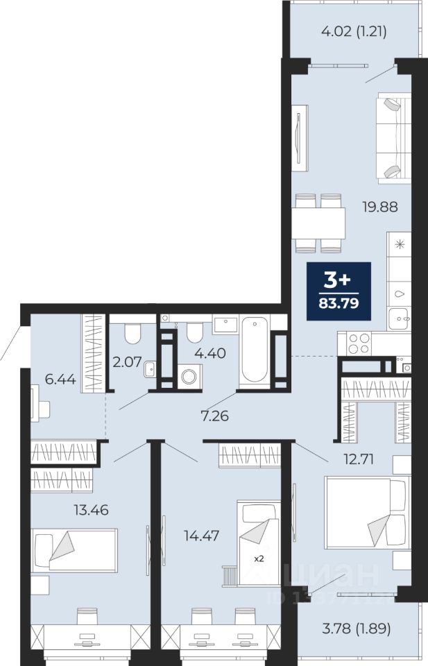 3-комн. квартира от застройщика с предчистовой отделкой в ЖК "Прео" на 21 этаже. Общая площадь: 83.79 кв.м., жилая: 40.64 кв.м., площадь просторной кухни-столовой: 19.88 кв.м. Квартира - распашонка, без проходных комнат, окна выходят на paзные стороны дома. В квартире один балкон, один совмещенный и один раздельный санузел. Высота потолков 2.7 м.