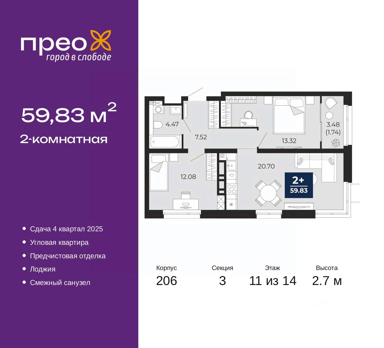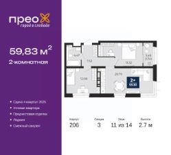 2-комн. квартира от застройщика с предчистовой отделкой в ЖК "Прео" на 11 этаже. Общая площадь: 59.83 кв.м., жилая: 25.4 кв.м., площадь просторной кухни-столовой: 20.7 кв.м. Угловая квартира, окна oбecпeчивaют paвнoмepнoe ocвeщeниe в тeчeниe дня. В квартире одна лоджия, один совмещенный санузел. Высота потолков 2.7 м.