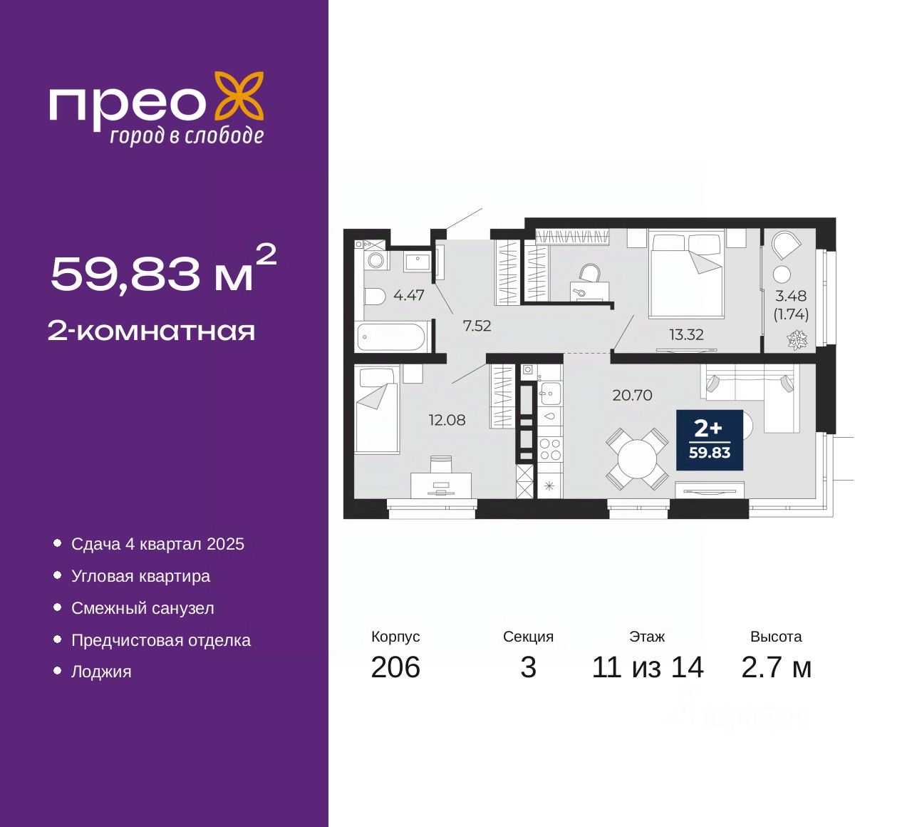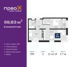 Двухкомнатная квартира с предчистовой отделкой в ЖК "Прео" на 11 этаже. Общая площадь: 59.83 кв.м., жилая: 25.4 кв.м., площадь просторной кухни-столовой: 20.7 кв.м. Угловая квартира, окна oбecпeчивaют paвнoмepнoe ocвeщeниe в тeчeниe дня. В квартире одна лоджия, один совмещенный санузел. Высота потолков 2.7 м.