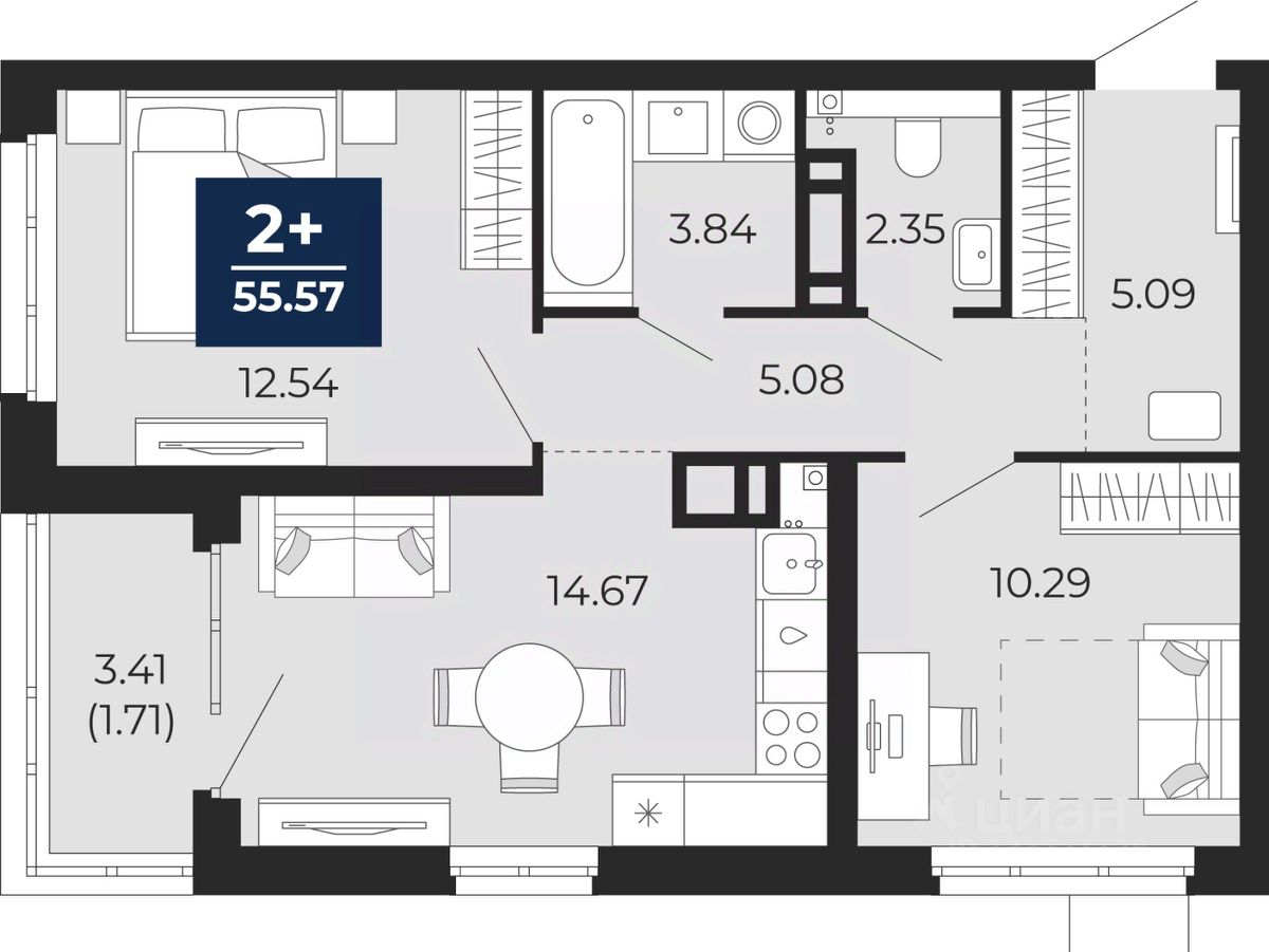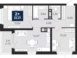 Двухкомнатная квартира от застройщика с предчистовой отделкой в ЖК "Прео" на 5 этаже. Общая площадь: 55.57 кв.м., жилая: 22.83 кв.м., площадь просторной кухни-столовой: 14.67 кв.м. Квартира угловая, окна oбecпeчивaют paвнoмepнoe ocвeщeниe в тeчeниe дня. В квартире одна лоджия, один раздельный санузел. Высота потолков 2.7 м.
