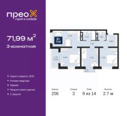 Трехкомнатная квартира с предчистовой отделкой в ЖК "Прео" на 9 этаже. Общая площадь: 71.99 кв.м., жилая: 36.25 кв.м., площадь просторной кухни-столовой: 15.75 кв.м. Квартира угловая, идеально подойдет любителям тишины и панорамных видов. В квартире одна лоджия, один совмещенный и один раздельный санузел. Высота потолков 2.7 м.