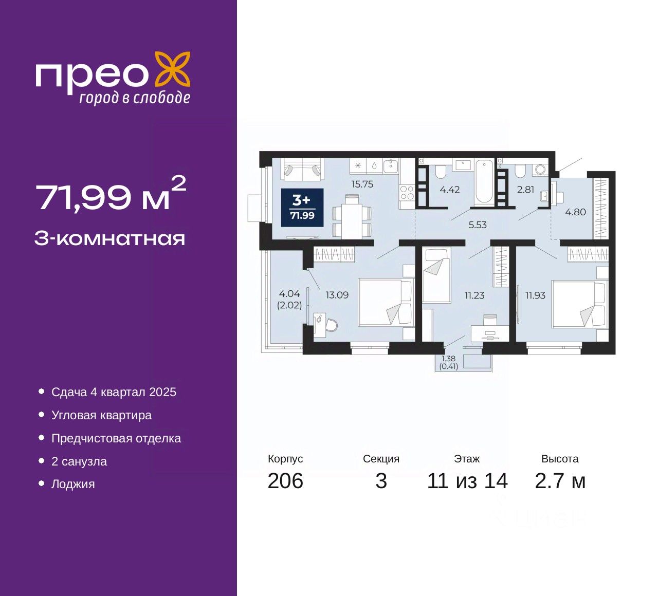 Просторная 3-комн. квартира с предчистовой отделкой в ЖК "Прео" на 11 этаже. Общая площадь: 71.99 кв.м., жилая: 36.25 кв.м., площадь просторной кухни-столовой: 15.75 кв.м. Квартира угловая, очень светлая, естественная вентиляция при открытии окон. В квартире одна лоджия, один совмещенный и один раздельный санузел. Высота потолков 2.7 м.