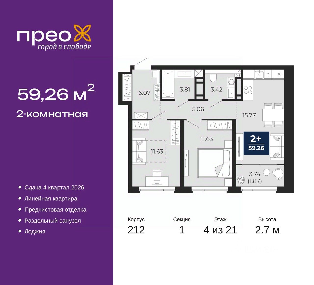 Просторная двухкомнатная квартира с предчистовой отделкой в ЖК "Прео" на 4 этаже. Общая площадь: 59.26 кв.м., жилая: 23.26 кв.м., площадь просторной кухни-столовой: 15.77 кв.м. Комнаты изолированные, все окна выходят на одну сторону. В квартире одна лоджия, один раздельный санузел. Высота потолков 2.7 м.