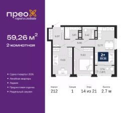 Двухкомнатная квартира с предчистовой отделкой в ЖК "Прео" на 14 этаже. Общая площадь: 59.26 кв.м., жилая: 23.26 кв.м., площадь просторной кухни-столовой: 15.77 кв.м. Комнаты изолированные, все окна выходят на одну сторону. В квартире одна лоджия, один раздельный санузел. Высота потолков 2.7 м.