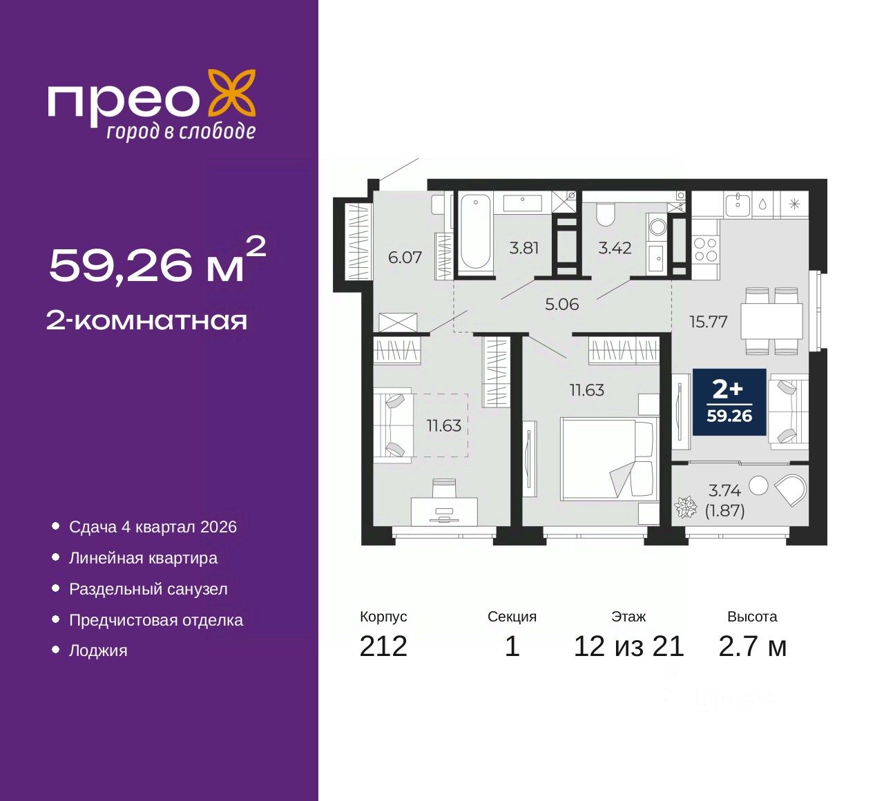 Просторная двухкомнатная квартира с предчистовой отделкой в ЖК "Прео" на 12 этаже. Общая площадь: 59.26 кв.м., жилая: 23.26 кв.м., площадь просторной кухни-столовой: 15.77 кв.м. Комнаты изолированные, все окна выходят на одну сторону. В квартире одна лоджия, один раздельный санузел. Высота потолков 2.7 м.