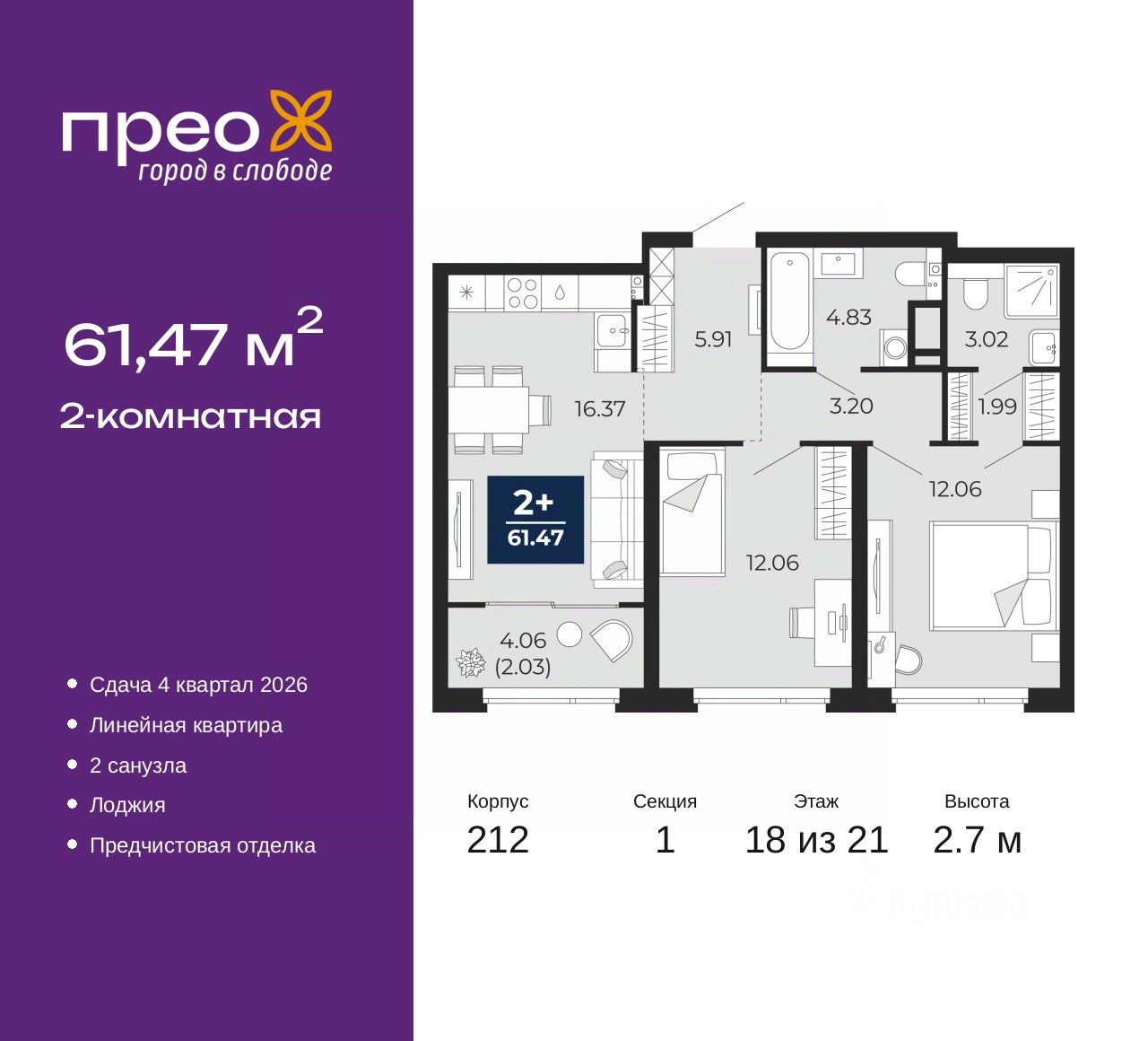 Продается 2-комн. квартира с предчистовой отделкой в ЖК "Прео" на 18 этаже. Общая площадь: 61.47 кв.м., жилая: 24.12 кв.м., площадь просторной кухни-столовой: 16.37 кв.м. Комнаты изолированные, все окна выходят на одну сторону. В квартире одна лоджия, два совмещенных санузла. Высота потолков 2.7 м.