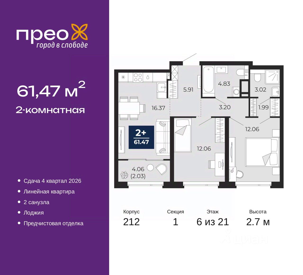 Двухкомнатная квартира с предчистовой отделкой в ЖК "Прео" на 6 этаже. Общая площадь: 61.47 кв.м., жилая: 24.12 кв.м., площадь просторной кухни-столовой: 16.37 кв.м. Комнаты изолированные, все окна выходят на одну сторону. В квартире одна лоджия, два совмещенных санузла. Высота потолков 2.7 м.