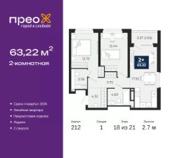 2-комн. квартира от застройщика с предчистовой отделкой в ЖК "Прео" на 18 этаже. Общая площадь: 63.22 кв.м., жилая: 25.19 кв.м., площадь просторной кухни-столовой: 17.92 кв.м. Комнаты изолированные, все окна выходят на одну сторону. В квартире одна лоджия, один совмещенный и один раздельный санузел. Высота потолков 2.7 м.