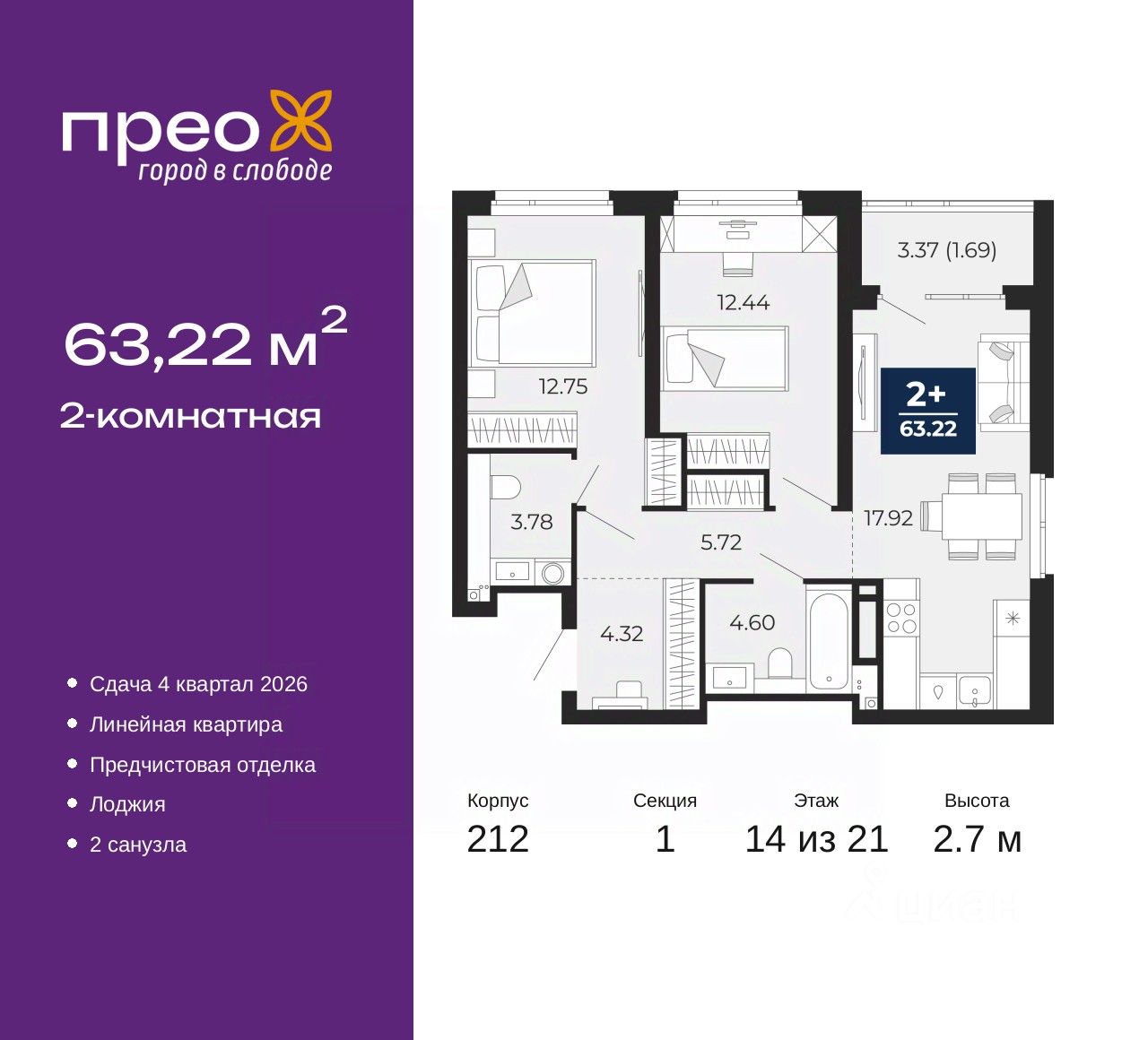 2-комн. квартира с предчистовой отделкой в ЖК "Прео" на 14 этаже. Общая площадь: 63.22 кв.м., жилая: 25.19 кв.м., площадь просторной кухни-столовой: 17.92 кв.м. Комнаты изолированные, все окна выходят на одну сторону. В квартире одна лоджия, один совмещенный и один раздельный санузел. Высота потолков 2.7 м.