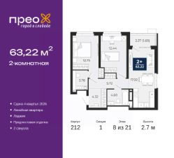 Продается 2-комн. квартира с предчистовой отделкой в ЖК "Прео" на 8 этаже. Общая площадь: 63.22 кв.м., жилая: 25.19 кв.м., площадь просторной кухни-столовой: 17.92 кв.м. Комнаты изолированные, все окна выходят на одну сторону. В квартире одна лоджия, один совмещенный и один раздельный санузел. Высота потолков 2.7 м.