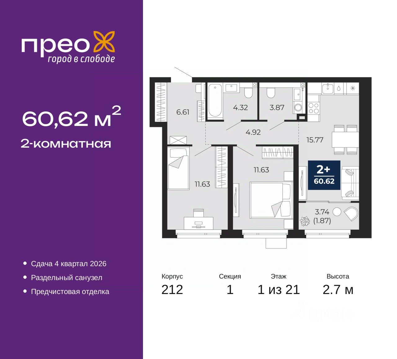Продается 2-комн. квартира с предчистовой отделкой в ЖК "Прео" на 1 этаже. Общая площадь: 60.62 кв.м., жилая: 23.26 кв.м., площадь просторной кухни-столовой: 15.77 кв.м. Комнаты изолированные, все окна выходят на одну сторону. В квартире одна лоджия, один совмещенный и один раздельный санузел. Высота потолков 2.7 м.