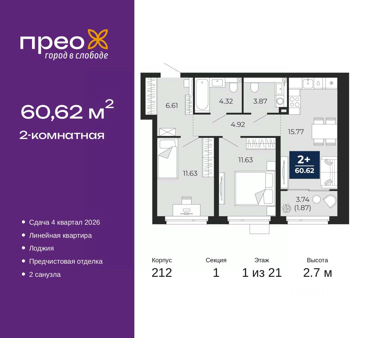 Просторная 2-комн. квартира с предчистовой отделкой в ЖК "Прео" на 1 этаже. Общая площадь: 60.62 кв.м., жилая: 23.26 кв.м., площадь просторной кухни-столовой: 15.77 кв.м. Комнаты изолированные, все окна выходят на одну сторону. В квартире одна лоджия, один совмещенный и один раздельный санузел. Высота потолков 2.7 м.