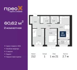 Продается двухкомнатная квартира с предчистовой отделкой в ЖК "Прео" на 1 этаже. Общая площадь: 60.62 кв.м., жилая: 23.26 кв.м., площадь просторной кухни-столовой: 15.77 кв.м. Комнаты изолированные, все окна выходят на одну сторону. В квартире одна лоджия, один совмещенный и один раздельный санузел. Высота потолков 2.7 м.