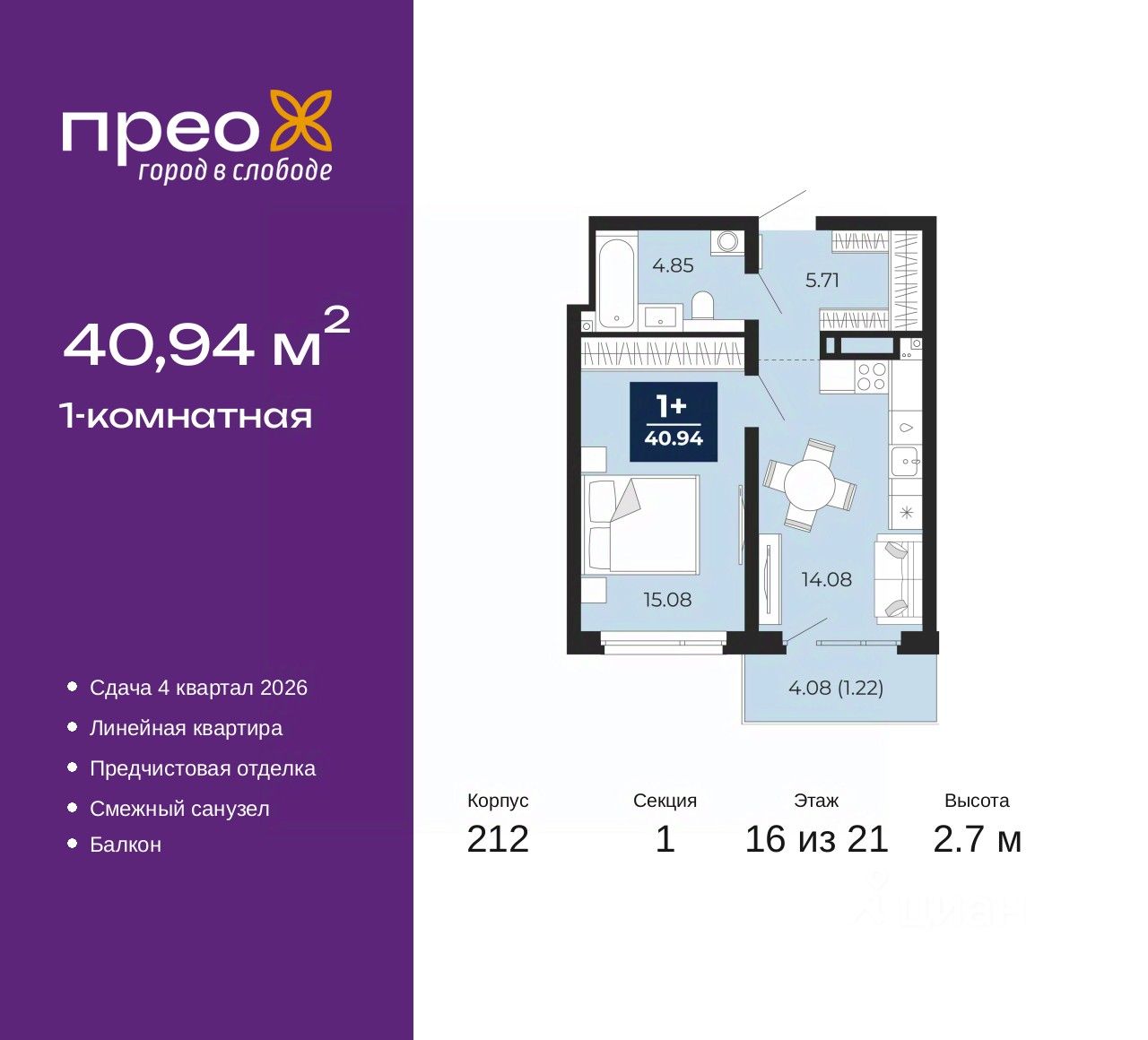 Продается однокомнатная квартира с предчистовой отделкой в ЖК "Прео" на 16 этаже. Общая площадь: 40.94 кв.м., жилая: 15.08 кв.м., площадь просторной кухни-столовой: 14.08 кв.м. Все окна выходят на одну сторону. В квартире один балкон, один совмещенный санузел. Высота потолков 2.7 м.