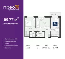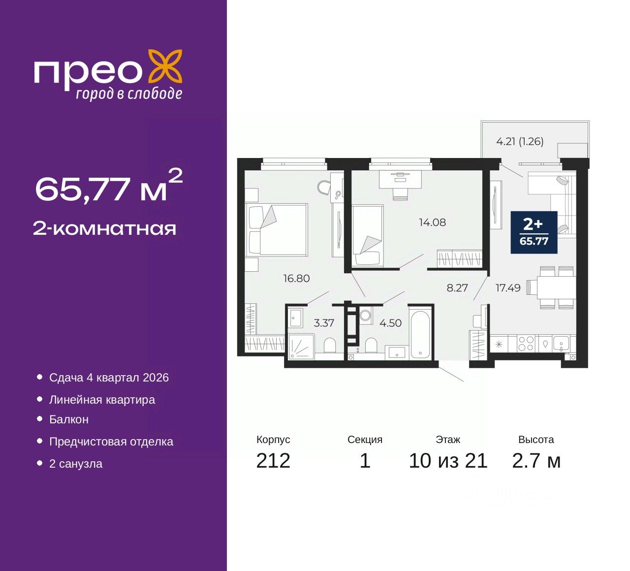 2-комн. квартира с предчистовой отделкой в ЖК "Прео" на 10 этаже. Общая площадь: 65.77 кв.м., жилая: 30.88 кв.м., площадь просторной кухни-столовой: 17.49 кв.м. Комнаты изолированные, все окна выходят на одну сторону. В квартире один балкон, два совмещенных санузла. Высота потолков 2.7 м.