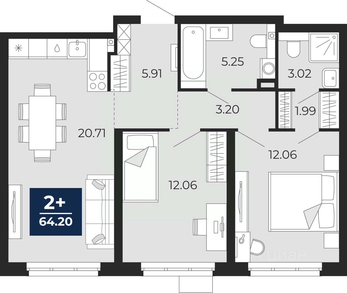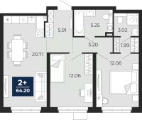 Просторная двухкомнатная квартира с предчистовой отделкой в ЖК "Прео" на 1 этаже. Общая площадь: 64.2 кв.м., жилая: 24.12 кв.м., площадь просторной кухни-столовой: 20.71 кв.м. Комнаты изолированные, все окна выходят на одну сторону. В квартире два совмещенных санузла. Высота потолков 2.7 м.
