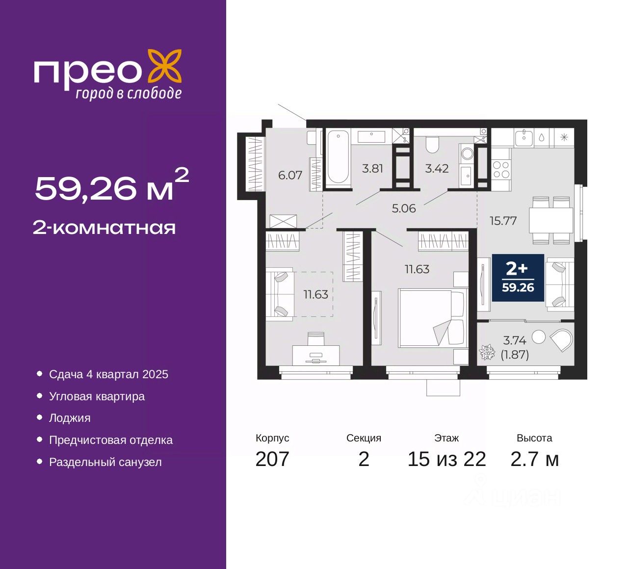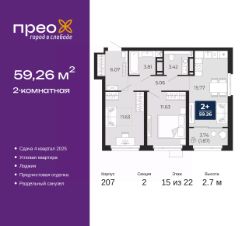 Двухкомнатная квартира с предчистовой отделкой в ЖК "Прео" на 15 этаже. Общая площадь: 59.26 кв.м., жилая: 23.26 кв.м., площадь просторной кухни-столовой: 15.77 кв.м. Квартира угловая, окна oбecпeчивaют paвнoмepнoe ocвeщeниe в тeчeниe дня. В квартире одна лоджия, один раздельный санузел. Высота потолков 2.7 м.
