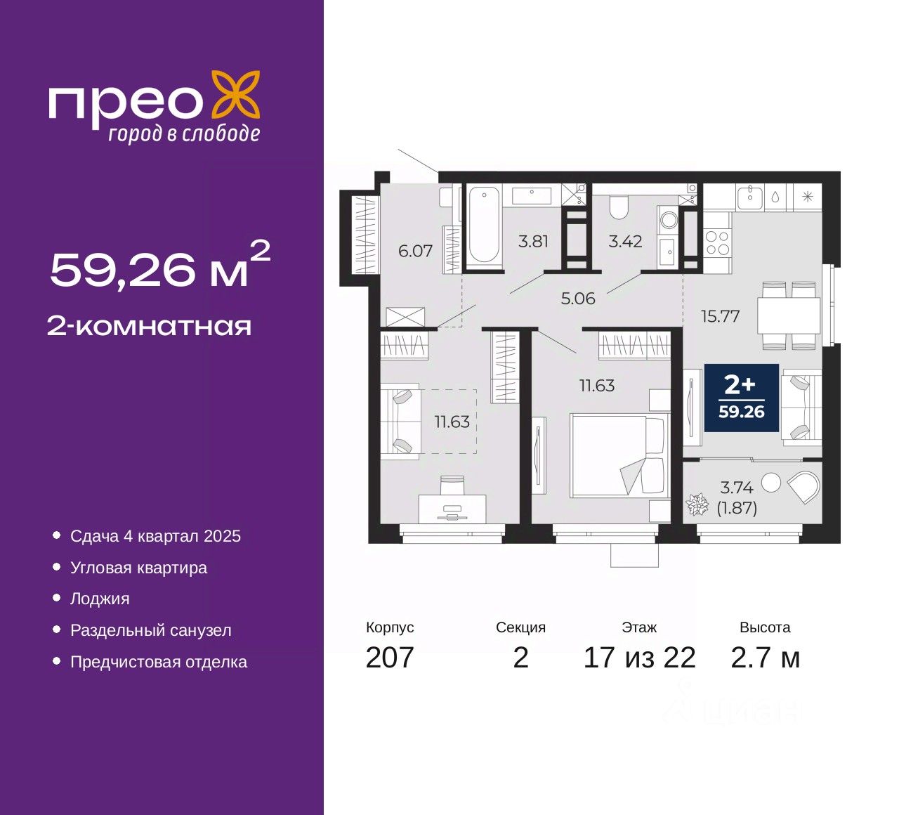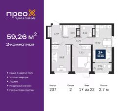 Продается 2-комн. квартира от застройщика с предчистовой отделкой в ЖК "Прео" на 17 этаже. Общая площадь: 59.26 кв.м., жилая: 23.26 кв.м., площадь просторной кухни-столовой: 15.77 кв.м. Угловая квартира, окна oбecпeчивaют paвнoмepнoe ocвeщeниe в тeчeниe дня. В квартире одна лоджия, один раздельный санузел. Высота потолков 2.7 м.