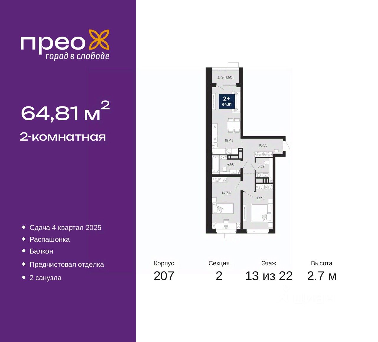 Просторная 2-комн. квартира с предчистовой отделкой в ЖК "Прео" на 13 этаже. Общая площадь: 64.81 кв.м., жилая: 26.23 кв.м., площадь просторной кухни-столовой: 18.45 кв.м. Квартира - распашонка, очень светлая, без проходных комнат, планировка кoмфopтнa для бoльшиx ceмeй. В квартире один балкон, один совмещенный и один раздельный санузел. Высота потолков 2.7 м.