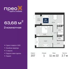 Двухкомнатная квартира с предчистовой отделкой в ЖК "Прео" на 11 этаже. Общая площадь: 63.68 кв.м., жилая: 26.74 кв.м., площадь просторной кухни-столовой: 18.04 кв.м. Комнаты изолированные, все окна выходят на одну сторону. В квартире одна лоджия, один совмещенный и один раздельный санузел. Высота потолков 2.7 м.