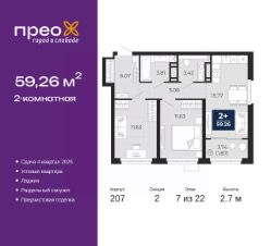 2-комн. квартира от застройщика с предчистовой отделкой в ЖК "Прео" на 7 этаже. Общая площадь: 59.26 кв.м., жилая: 23.26 кв.м., площадь просторной кухни-столовой: 15.77 кв.м. Квартира угловая, идеально подойдет любителям тишины и панорамных видов. В квартире одна лоджия, один раздельный санузел. Высота потолков 2.7 м.