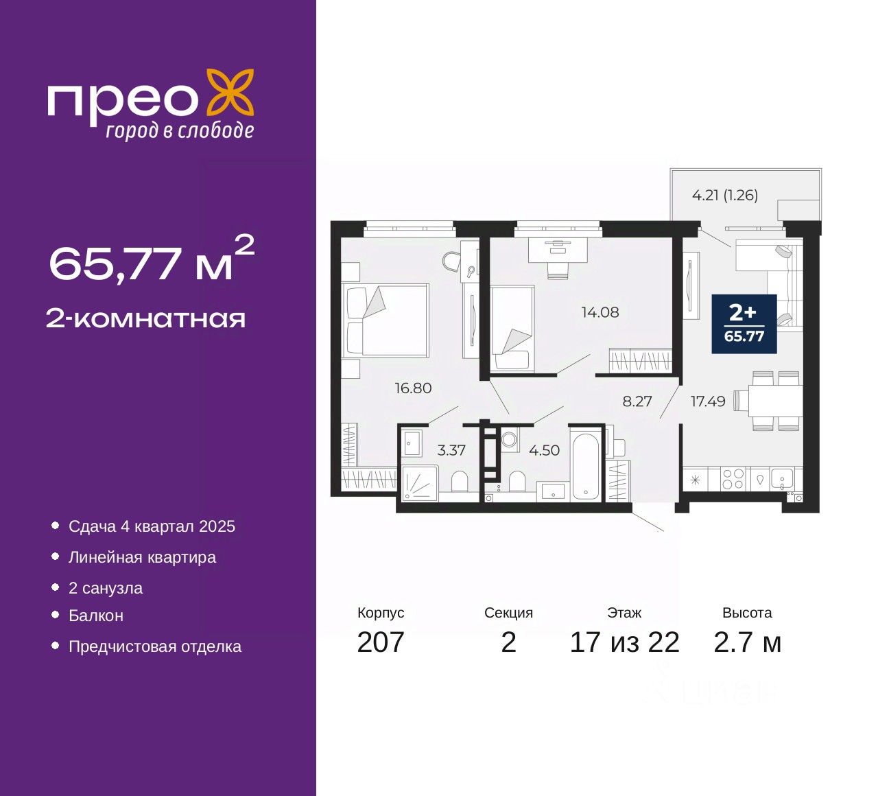 Продается двухкомнатная квартира с предчистовой отделкой в ЖК "Прео" на 17 этаже. Общая площадь: 65.77 кв.м., жилая: 30.88 кв.м., площадь просторной кухни-столовой: 17.49 кв.м. Комнаты изолированные, все окна выходят на одну сторону. В квартире один балкон, два совмещенных санузла. Высота потолков 2.7 м.