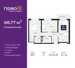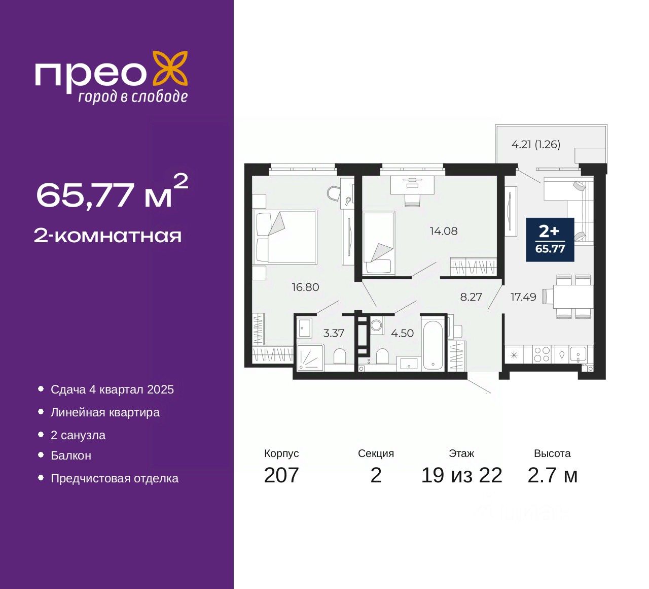 2-комн. квартира с предчистовой отделкой в ЖК "Прео" на 19 этаже. Общая площадь: 65.77 кв.м., жилая: 30.88 кв.м., площадь просторной кухни-столовой: 17.49 кв.м. Комнаты изолированные, все окна выходят на одну сторону. В квартире один балкон, два совмещенных санузла. Высота потолков 2.7 м.