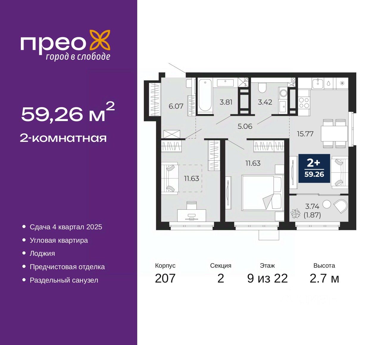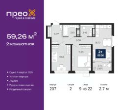 Двухкомнатная квартира с предчистовой отделкой в ЖК "Прео" на 9 этаже. Общая площадь: 59.26 кв.м., жилая: 23.26 кв.м., площадь просторной кухни-столовой: 15.77 кв.м. Квартира угловая, идеально подойдет любителям тишины и панорамных видов. В квартире одна лоджия, один раздельный санузел. Высота потолков 2.7 м.