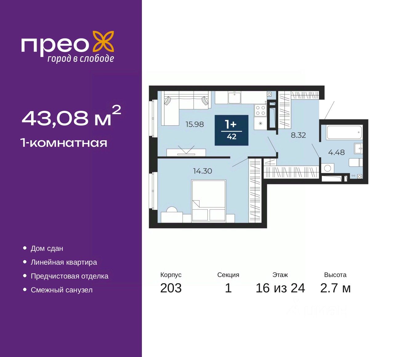 Просторная однокомнатная квартира с предчистовой отделкой в ЖК "Прео" на 16 этаже. Общая площадь: 43.08 кв.м., жилая: 14 кв.м., площадь просторной кухни-столовой: 15.98 кв.м. Все окна выходят на одну сторону. В квартире один совмещенный санузел. Высота потолков 2.7 м.