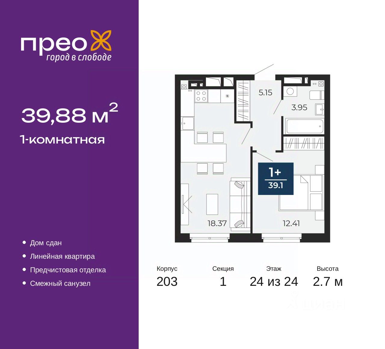 Просторная 1-комн. квартира с предчистовой отделкой в ЖК "Прео" на 24 этаже. Общая площадь: 39.88 кв.м., жилая: 12.41 кв.м., площадь просторной кухни-столовой: 18.37 кв.м. Все окна выходят на одну сторону. В квартире один совмещенный санузел. Высота потолков 2.7 м.