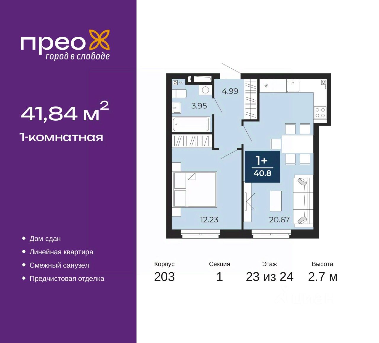 Просторная 1-комн. квартира с предчистовой отделкой в ЖК "Прео" на 23 этаже. Общая площадь: 41.84 кв.м., жилая: 12.23 кв.м., площадь просторной кухни-столовой: 20.67 кв.м. Все окна выходят на одну сторону. В квартире один совмещенный санузел. Высота потолков 2.7 м.