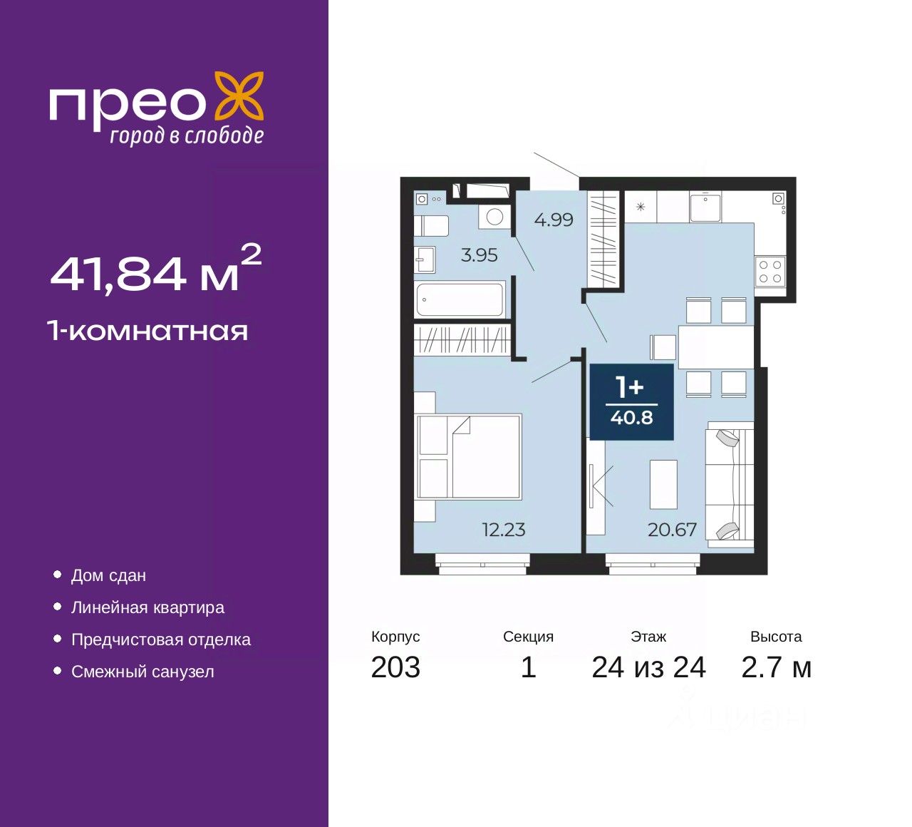 Просторная однокомнатная квартира с предчистовой отделкой в ЖК "Прео" на 24 этаже. Общая площадь: 41.84 кв.м., жилая: 12.23 кв.м., площадь просторной кухни-столовой: 20.67 кв.м. Все окна выходят на одну сторону. В квартире один совмещенный санузел. Высота потолков 2.7 м.