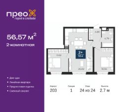 Продается двухкомнатная квартира с предчистовой отделкой в ЖК "Прео" на 24 этаже. Общая площадь: 56.57 кв.м., жилая: 21.96 кв.м., площадь просторной кухни-столовой: 25.02 кв.м. Комнаты изолированные, все окна выходят на одну сторону. В квартире один совмещенный санузел. Высота потолков 2.7 м.