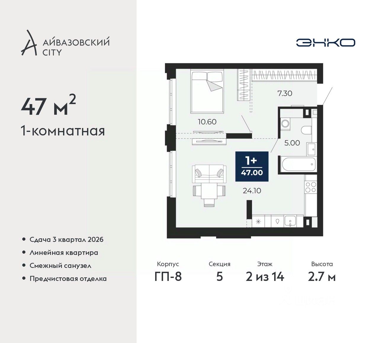 Однокомнатная квартира с предчистовой отделкой в ЖК "Айвазовский City" на 2 этаже. Общая площадь: 47 кв.м., жилая: 10.6 кв.м., площадь просторной кухни-столовой: 24.1 кв.м. Все окна выходят на одну сторону. В квартире один совмещенный санузел. Высота потолков 2.7 м.