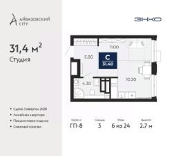 1-комн. квартира-студия с предчистовой отделкой в ЖК "Айвазовский City" на 6 этаже. Общая площадь: 31.4 кв.м., площадь гостиной 21.3 кв.м., из которых 10.3 кв.м. выделено под кухонную зону. Все окна выходят на одну сторону. В квартире один совмещенный санузел. Высота потолков 2.7 м.