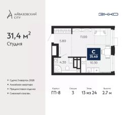 Продается однокомнатная квартира-студия с предчистовой отделкой в ЖК "Айвазовский City" на 13 этаже. Общая площадь: 31.4 кв.м., площадь гостиной 21.3 кв.м., из которых 10.3 кв.м. выделено под кухонную зону. Все окна выходят на одну сторону. В квартире один совмещенный санузел. Высота потолков 2.7 м.