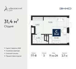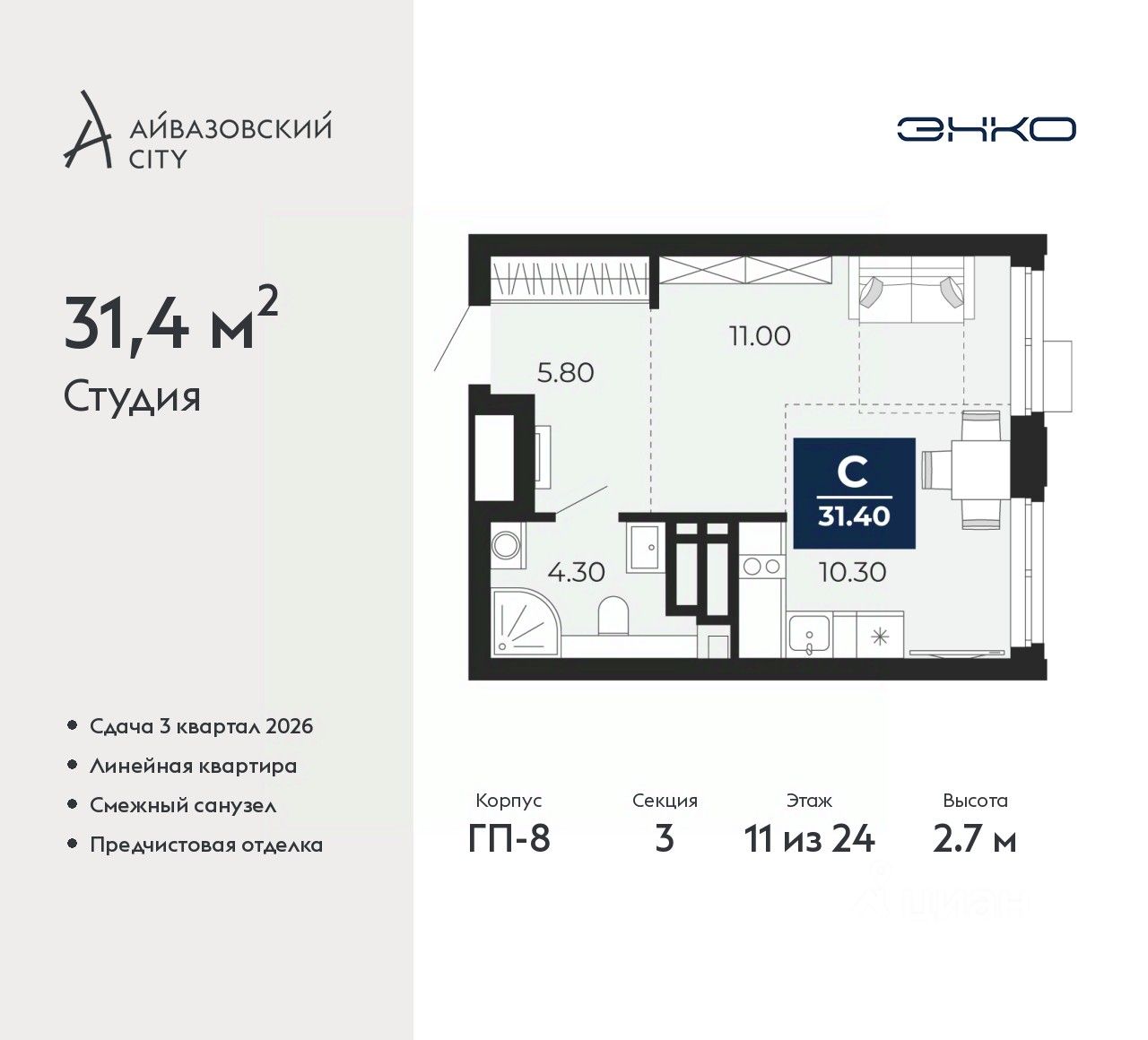 Продается однокомнатная квартира-студия от застройщика с предчистовой отделкой в ЖК "Айвазовский City" на 11 этаже. Общая площадь: 31.4 кв.м., площадь гостиной 21.3 кв.м., из которых 10.3 кв.м. выделено под кухонную зону. Все окна выходят на одну сторону. В квартире один совмещенный санузел. Высота потолков 2.7 м.