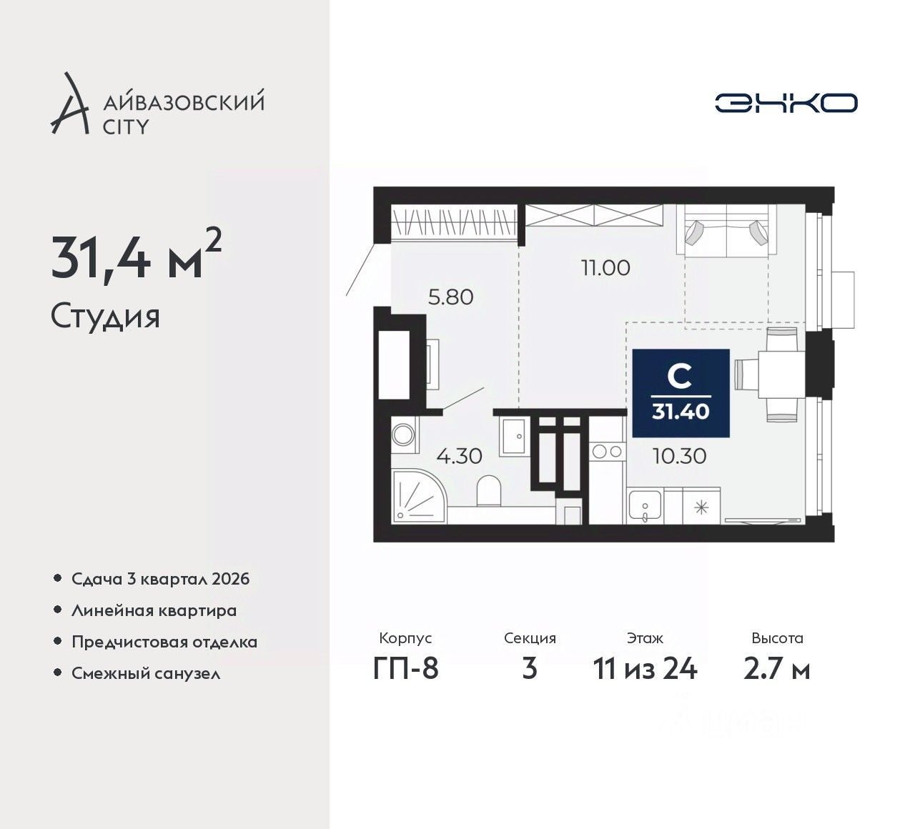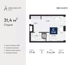Продается однокомнатная квартира-студия с предчистовой отделкой в ЖК "Айвазовский City" на 11 этаже. Общая площадь: 31.4 кв.м., площадь гостиной 21.3 кв.м., из которых 10.3 кв.м. выделено под кухонную зону. Все окна выходят на одну сторону. В квартире один совмещенный санузел. Высота потолков 2.7 м.