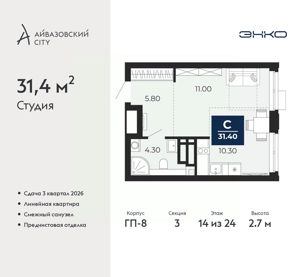1-комн. квартира-студия от застройщика с предчистовой отделкой в ЖК "Айвазовский City" на 14 этаже. Общая площадь: 31.4 кв.м., площадь гостиной 21.3 кв.м., из которых 10.3 кв.м. выделено под кухонную зону. Все окна выходят на одну сторону. В квартире один совмещенный санузел. Высота потолков 2.7 м.